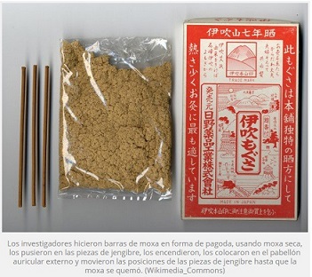 Luego, los investigadores hicieron barras de moxa en forma de pagoda usando moxa seca, los pusieron en las piezas de jengibre, los encendieron, los colocaron en el pabellón auricular externo y movieron las posiciones de las piezas de jengibre hasta que la moxa se quemó. Se usaron dos barras de moxa para cada tratamiento. Uno de ellos se administró diariamente, durante un período de 10 días.