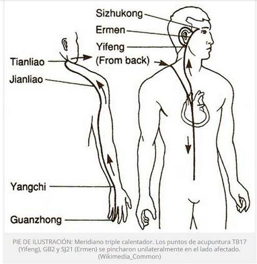 Durante el tratamiento de acupuntura, se aplicó agujas a TB17 (Yifeng), GB2 (Tinghui), SJ21 (Ermen), SI19 (Tinggong), LU7 (Lieque), GB43 (Xiaxi), SJ3 (Zhongzhu), LR3 (Taichong) y GB40 (Qiuxu). Los puntos de acupuntura TB17, GB2 y SJ21 se pincharon unilateralmente en el lado afectado.